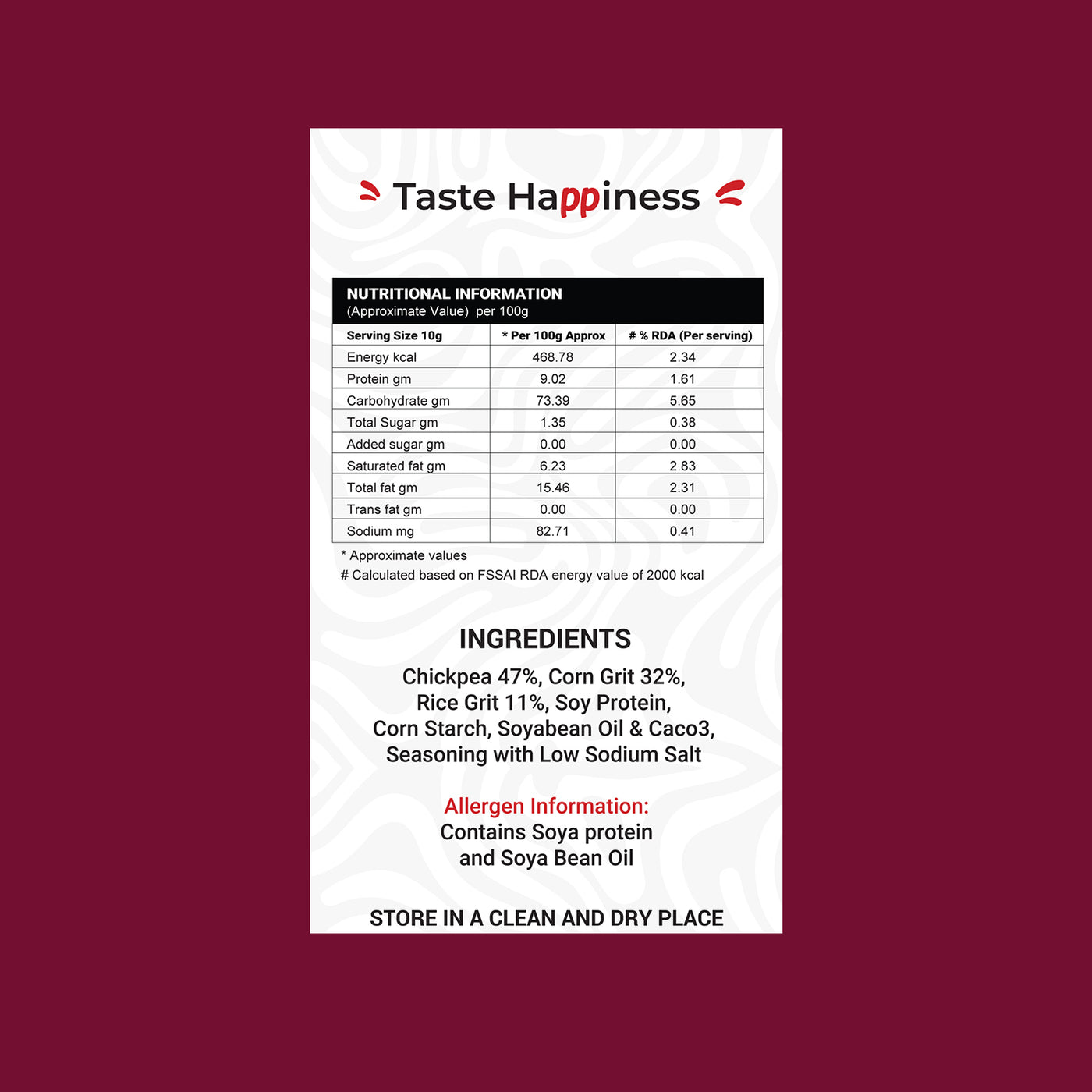 Chick Pea 47%, Corn Grit 32%, Rice Grit 11%, Soy Protein, Corn Starch, Soyabean Oil & Caco3  Seasoning with Low sodium salt